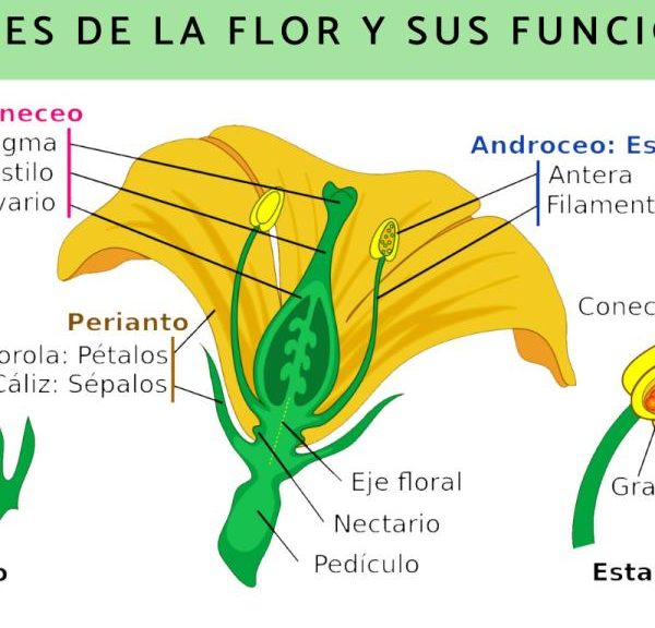 La parte de la flor que contiene los órganos reproductivos se llama «Androceo» en las flores masculinas y «Gineceo» en las flores femeninas.